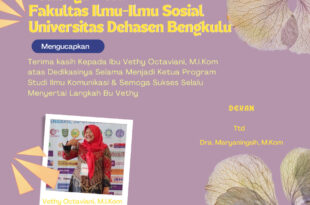Keluarga Besar Fakultas Ilmu-Ilmu Sosial Universitas Dehasen Bengkulu Mengucapkan terima kasih kepada Ibu Vethy Octaviani, M.I.Kom atas dedikasinya selama menjadi ketua Program Studi Ilmu Komunikasi dan semoga sukses selalu menyertai Langkah bu Vethy.