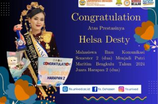 Selamat Kepada Helsa Desty! mahasiswa Ilmu Komunikasi semester 2 (dua) Fakultas Ilmu-Ilmu Sosial Unived Bengkulu, atas prestasinya telah meraih Juara Harapan 2 Putri Maritim Tahun 2024, yang di selenggarakan oleh Dinas Pariwisata dan TNI AL. Prestasi ini merupakan hasil dari kerja keras, dedikasi, dan semangat Helsa yang tinggi. kami sangat …
