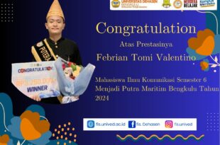 Selamat Kepada Febrian Tomi Valentino mahasiswa Ilmu Komunikasi semester 6 Fakultas Ilmu-Ilmu Sosial Unived Bengkulu, atas prestasinya telah meraih prestasi gemilang sebagai Putra Maritim Tahun 2024 yang di selenggarakan oleh Dinas Pariwisata dan TNI AL. Prestasi ini merupakan bukti dedikasi dan kegigihan Febrian dalam bidang maritim. Semoga Febrian dapat …