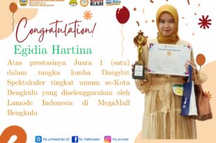 Selamat kepada Egidia Hartina mahasiswi Semester IV (empat) Prodi Administrasi Publik Fakultas Ilmu-Ilmu Sosial Universitas Dehasen Bengkulu, yang telah mengikutsertakan dengan kegiatan lomba Dangdut Spektakuler tingkat umum se-Kota Bengkulu yang diselenggarakan oleh Lamode Indonesia di MegaMall Bengkulu pada tanggal 3 Maret 2024 dan memenangkan lomba Juara 1 (satu).